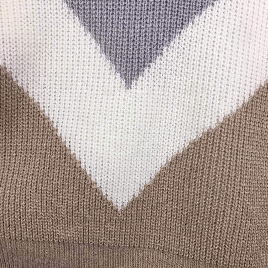 Ce pull se distingue par son motif en forme de V inversé qui apporte une touche graphique et dynamique à l’ensemble. La disposition des sections contrastantes crée un effet visuel captivant qui attire immédiatement l’attention. Grâce à ce design audacieux, ce vêtement est une pièce forte qui ajoute du caractère à n'importe quelle tenue.