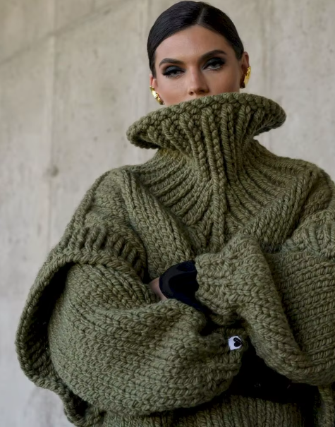 La femme sur l’image porte un pull en grosse maille grise qui se distingue par son design oversize et son col roulé imposant. Les manches longues et bouffantes ajoutent une touche de volume, renforcée par des détails tricotés sur les épaules. Ce style de pull est idéal pour affronter le froid tout en restant élégante et moderne.