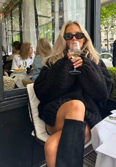 Associé à un pantalon noir ajusté et une bandoulière noire, ce pull crée un équilibre parfait entre confort et sophistication. Les lunettes de soleil aux montures épaisses apportent une touche de caractère et de mystère. Le décor urbain en arrière-plan, avec un mur en béton brut, contraste avec la douceur et la chaleur du pull, mettant en avant l’allure de la tenue.